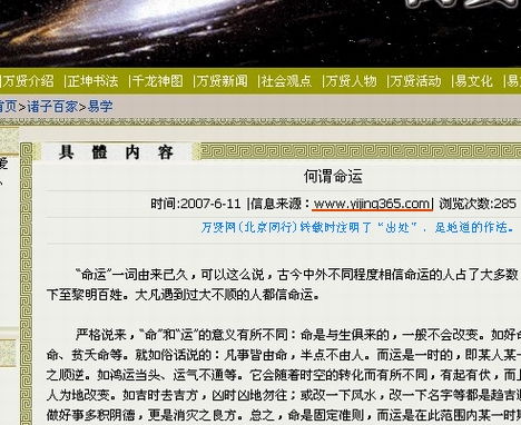 2个月前,我无意中看到别的网站注明转自“www.yijing365.com”的帖子“何谓命运”,心想怎么如此眼熟?顺便追查过去一看,正所谓不看不知道,一看吓一跳。竟然如我前面说的,该网站“八卦四柱”栏目的9篇文章一字不拉全部抄袭了本公司另一网站www.qm18.com 同类栏目“命理相学”里的9篇帖子。除了色调不一样,网站风格、栏目设置,包括起名、风水等主要栏目和文章,几乎可用“约等于”来形容,各位有兴趣的朋友也可点入作一比较。发现后我即给他们发了希望妥善处理的电邮,因为负责人是相识的,起码先礼后兵也应是做人的道德。可惜他们没有反馈也没有任何处理,这才是我今天要抽个空写本帖的动因,既然不要面子,就勿怪我没口德了。意赵易命名商标起名起名公司产品起名网站婴儿起名个人起名宝宝起名